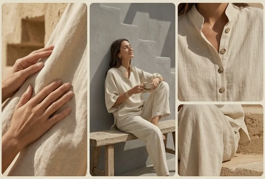 Leinen und Baumwolle werden besonders in der warmen Jahreszeit gern getragen, weil sich das Material leicht anfühlt, atmungsaktiv wirkt und im Alltag unkompliziert bleibt. Genau das macht dieses Set zu einer praktischen Wahl für viele Gelegenheiten.